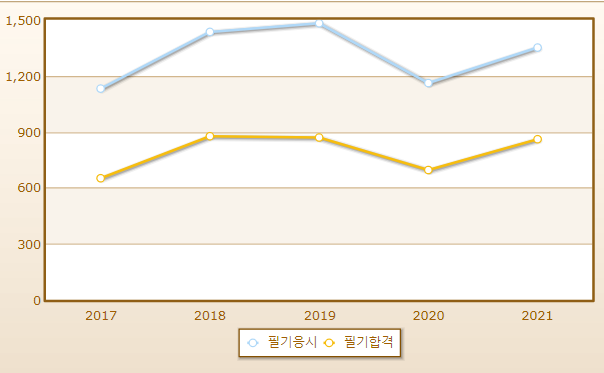 연도별 필기시험 합격률이며 2021년 기준 응시자 수는 1,351명으로 그 중 합격자는 860명입니다.