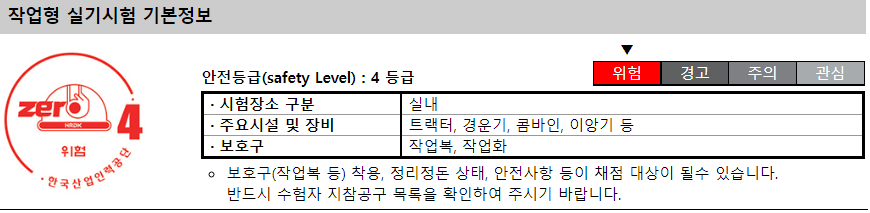실기시험은 안전등급 4등급의 시험으로 꼭 보호구 및 수험생 지참공구 목록을 확인하여 챙기셔야 감점을 당하지 않으니 유의하시길 바랍니다.