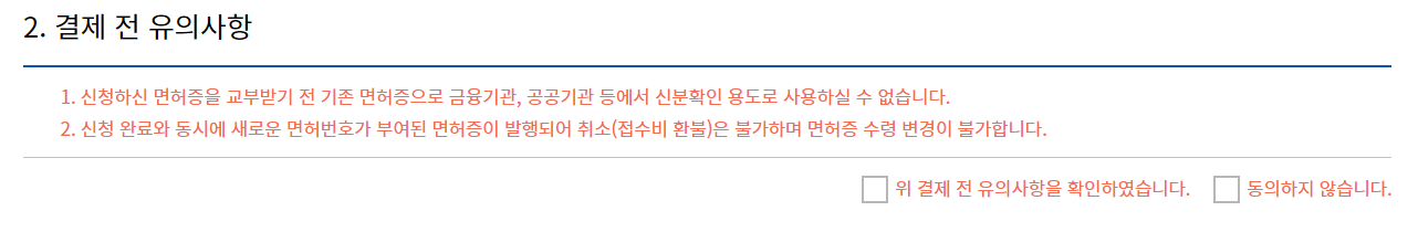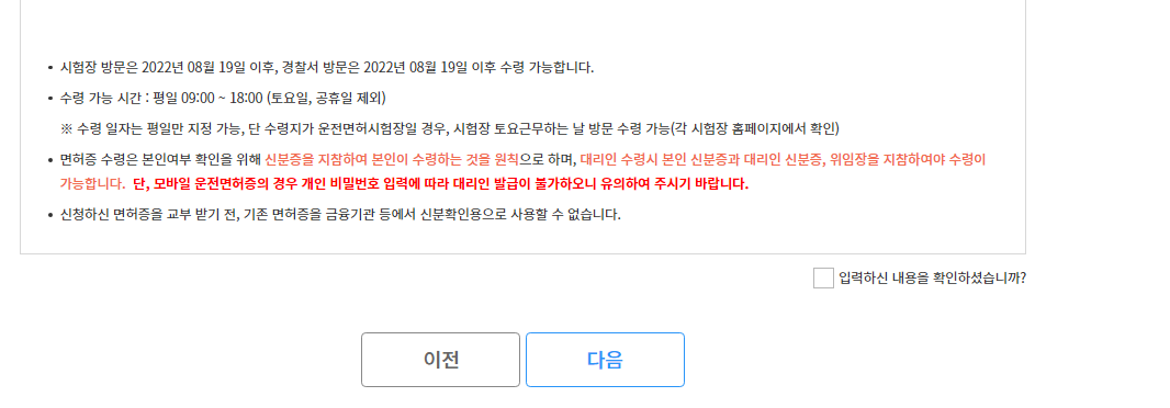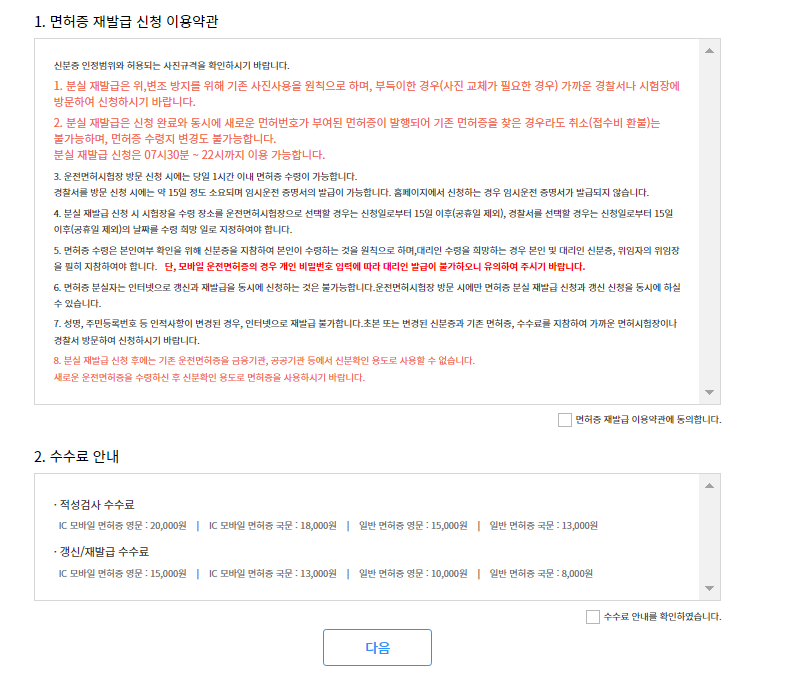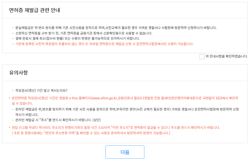 면허증 재발급 관련 안내에 확인 체크! 후 다음 버튼을 눌러줍니다.