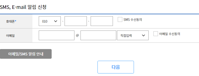 SMS 나 E-mail을 이용하여 알림을 받는 서비스를 신청하시면 됩니다. 휴대폰은 필수여서 휴대폰만 했습니다.