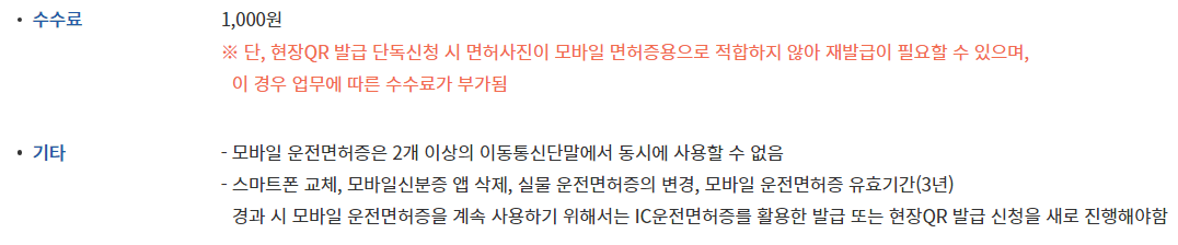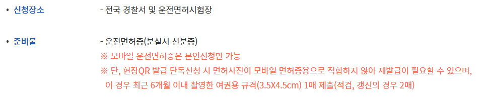 모바일 운전면허증 구비서류 및 수수료 신청장소 - 전국 경찰서 및 운전면허시험장 준비물 - 운전면허증(분실시 신분증) ※ 모바일 운전면허증은 본인신청만 가능 ※ 단, 온라인 신청 시 등록된