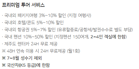 프리미엄서비스는 펜션 콘도 할인 렌터카 무료 등 여러 혜택이 있으니 꼭 챙기셔서 아낍시다!