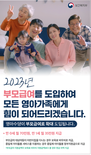 부모급여란 정부가 올해 1우러부터 돌봄이 집중적으로 필요한 영아를 위해 가정에서 맘 편히 돌 볼 수 있도록 부모급여를 지원하기로 했습니다.