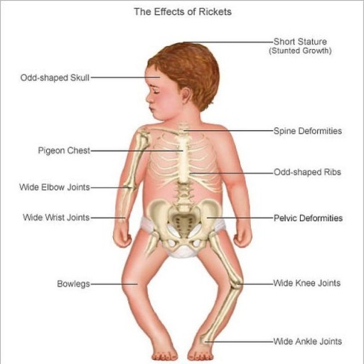 비타민D가 부족하면 뼈에 칼슘이 붙기 어려워 뼈의 변형(안짱다리 등)이나 성장 장애 등이 일어난다.