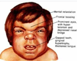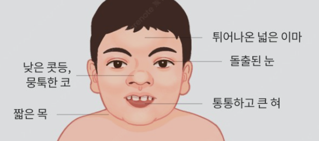 이 질병을 가진 사람은 지능 장애와 함께 외형적으로는 정사인보다 키가 작고, 튀어 나온 넓은 이마, 돌출된 눈, 낮으면서 넓은 코, 두터운 입술, 큰 혀 등의 특징을 보이며 척추가 휘는 등의 골격 기형이 나타 날 수 있습니다.