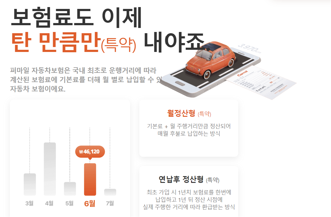캐롯퍼마일 자동차보험은 국내 최초로 탄만큼만 매월 후불로 지불하는 시스템이 있습니다.