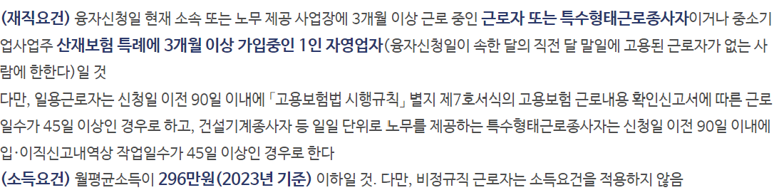 | 우선순위 적용 선발 시 추가 제출 | ▶ 직전년도 소득자별 원천징수영수증 사본 ▶ 직전년도 근로자 본인 및 배우자 소득금액증명원(종합소득세 신고자용) ▶ 가족관계증명서 ▶ 「북한이탈주민 거주지보호 및 신원확인 등에 관한 지침」에 따른 북한이탈주민등록확인서 |