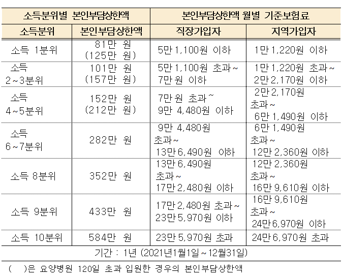 소득분위별 본인부담상한액 및 월별 기준보험료