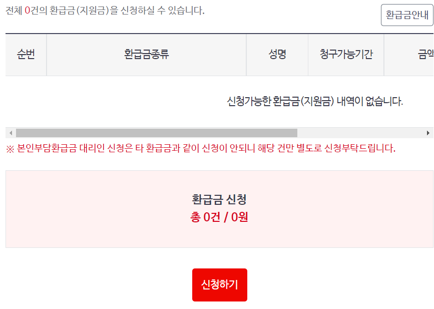 인증 요청 후 인증 완료를 누르면 다시 홈페이지가 뜨고 환급금 조회 및 신청을 다시 누르면 아래 사진과 같이 정보가 나옵니다.