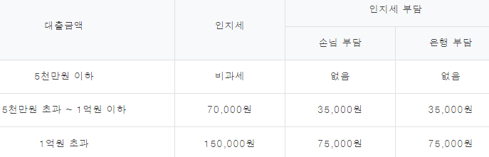 인지세란 대출 거래 신규 약정 시 내는 세금으로 대출금액에 따라 아래와 같이 인지세를 은행과 고객이 각각 50%씩 부담하게 됩니다.