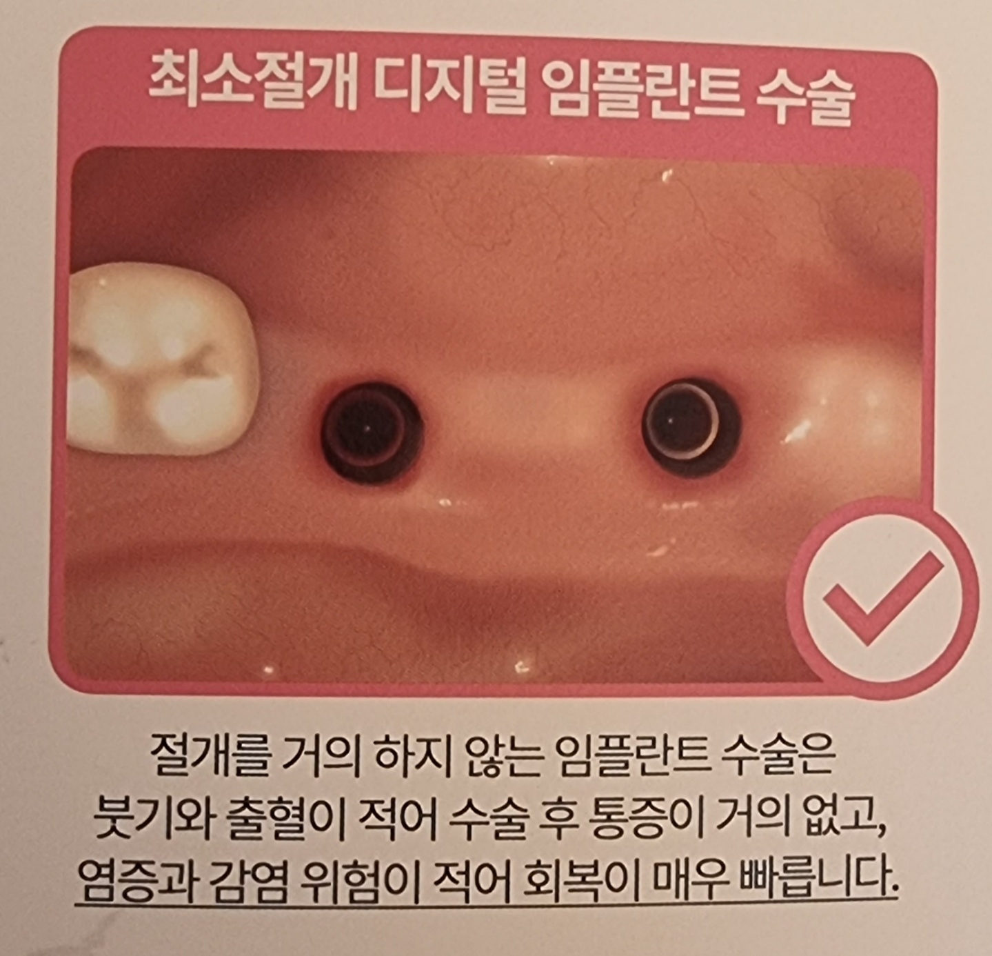 수술 할 때 절개부위가 2~3mm 정도 최소 절개 후 임플란트 수술을 진행하기 때문에 수술 후 통증 및 회복력 등 여러 방면으로 좋습니다.