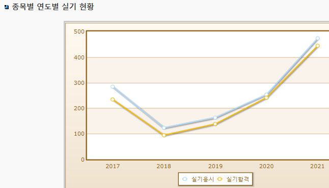 실기시험 연도별 합격률이며 2021년 기준 실기시험 응시자 수는 473명으로 그 중 합격자는 444명입니다.
