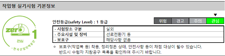 실기시험 안전레벨은 1등급 시험으로 기본 수험생 지참공구 목록만 잘 확인하셔서 시험 보시길 바라겠습니다.