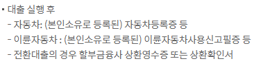 이 상품의 대출 조건은 차주명의로 자동차 등록이 완료되어야 하며 전환대출을 실행 할 경우(캐피탈 등에서 대환대출) 할부금융사 상환영수증 또는 상환확인서를 상환 한 후 즉시 제출해야 합니다.
