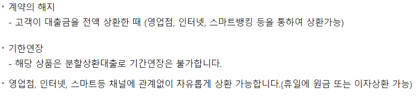 이 상품은 쉽고 편리하게 생활안정자금을 받을 수 있는 상품으로 영업점 또는 스마트뱅킹을 통하여 대출 신청이 가능하며 중도상환해약금이 없어 자유롭게 상환이 가능한 상품이라 자금 운용만 잘하면 급할 땐 쓰고 돈이 남을 땐 갚으면 되서 이자 비용을 아낄 수 있는 장점이 있는 상품입니다.